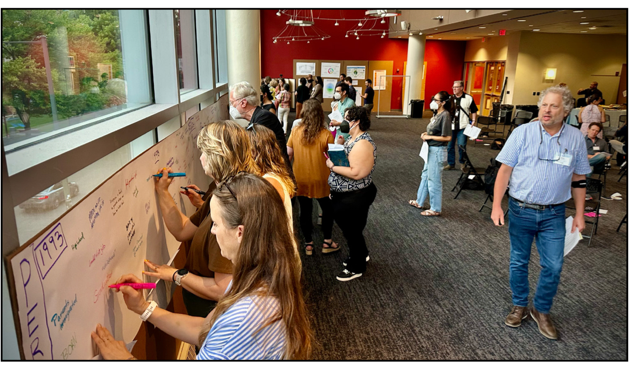 In a Future Search, the next activity is to create a mind map of the challenges the topic focus faces. The evening ends by inviting people to put dots on the most critical challenges. The group then circles the ones with the most dots. It leaves people to sleep on the mess, the unfinished business. We didn’t do that for our journalism conference. Instead, we opened the space the next day.