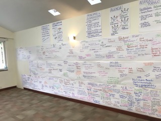 Unfortunately, I don’t have good pictures of the timelines from the journalism meeting. I’ve attached a picture of what the graphic recorder captured from the reports the groups did and from the whole group discussion. Some examples of times lines from other Future Searches are also attached.